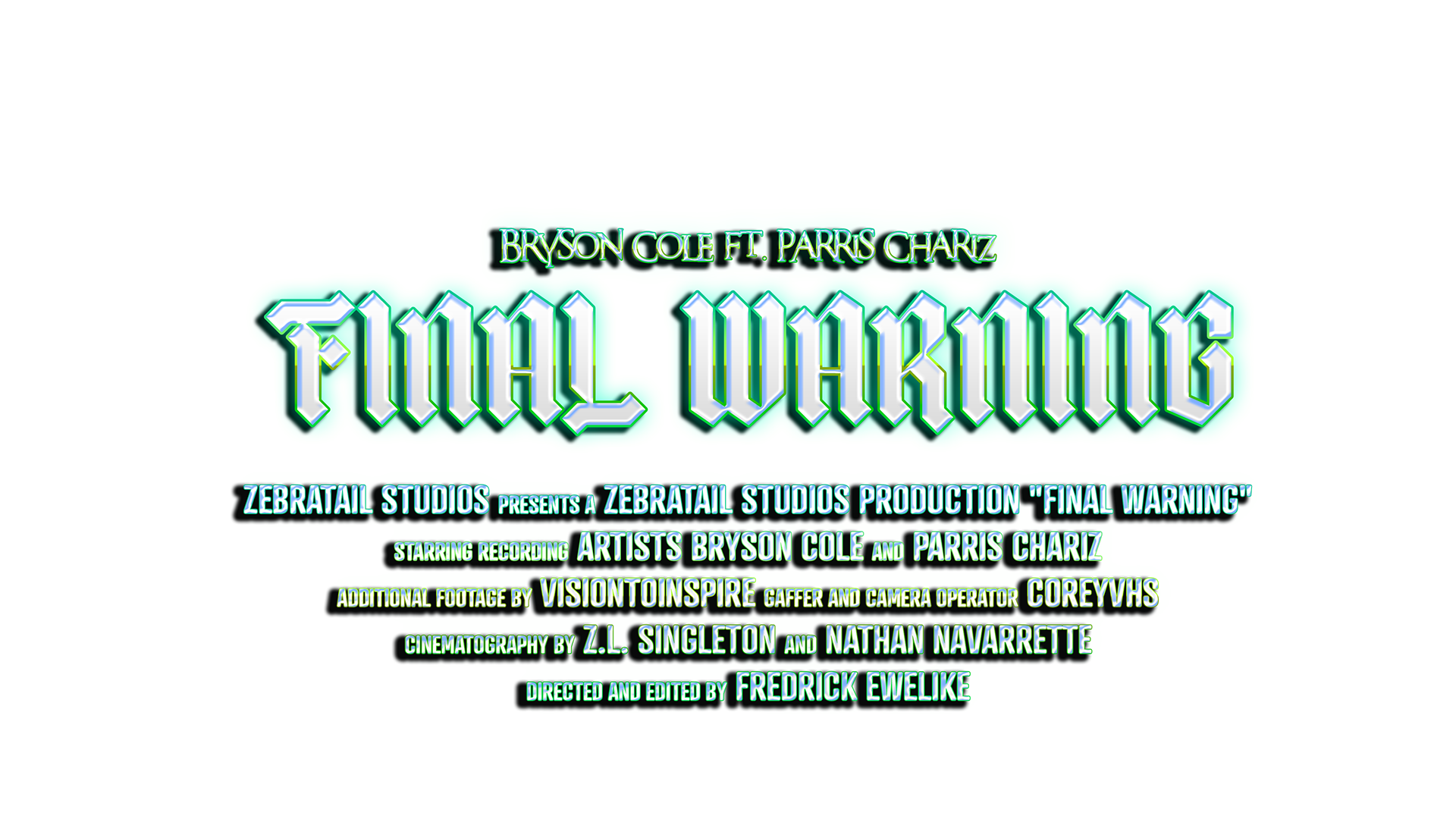 "Final Warning" was a music video helmed by Fredrick Ewelike from Zebratail Studios, showcasing artists Bryson Cole and Parris Chariz. I was involved in enhancing the texture and crafting the design of the title card and font for the video using Adobe Photoshop.