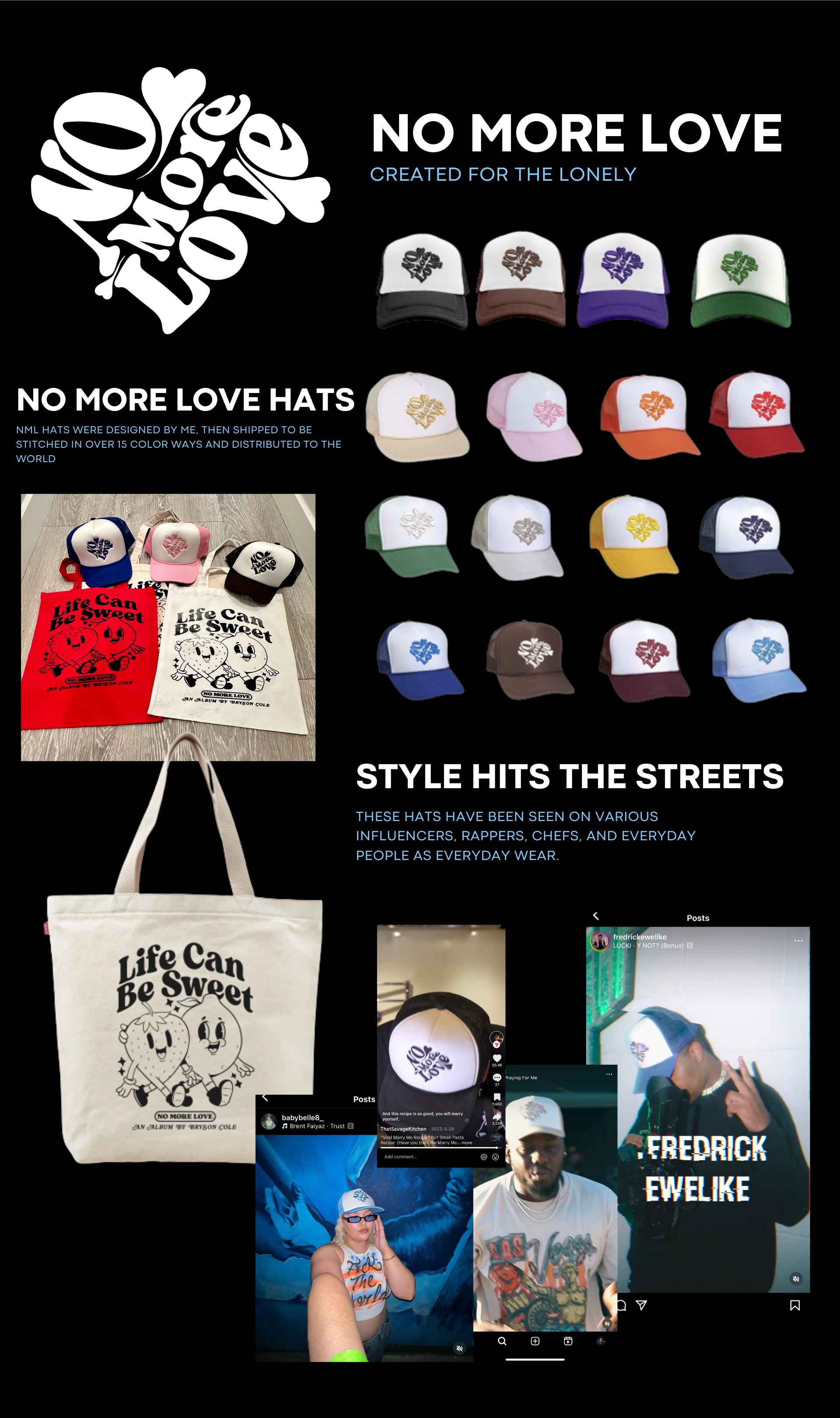 'No More Love' emerged as a triumphant passion endeavor, giving rise to a distinctive brand centered around the musician Bryson Cole. I conceptualized the No More Love logo and crafted stylish trucker hats, which became highly sought-after during that period. Additionally, I designed trendy tote bags catering to the female demographic, enjoying robust sales at various musical events.